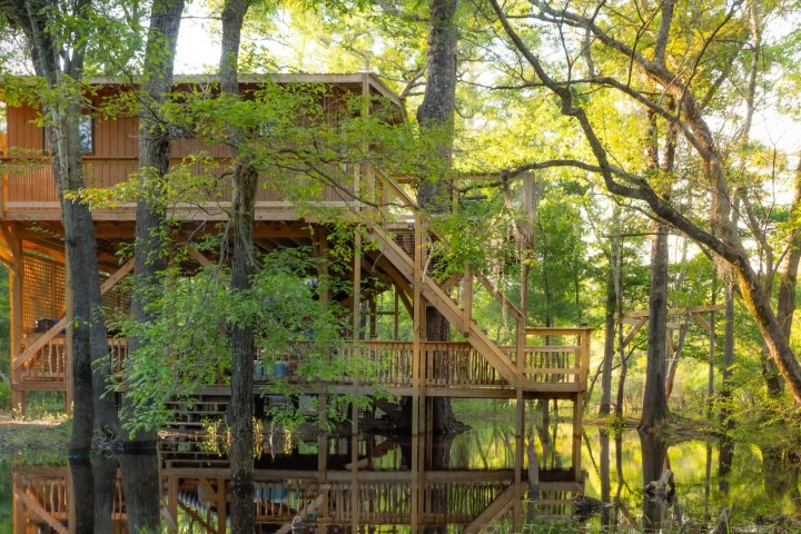 Throughout the year the river level can change dramatically based on rainfall amounts. Sometimes the river is only a foot deep with white sandy river banks on each side and at times there is a foot or more of water on the island giving a beautiful over-water bungalow feel to the Treehouse.