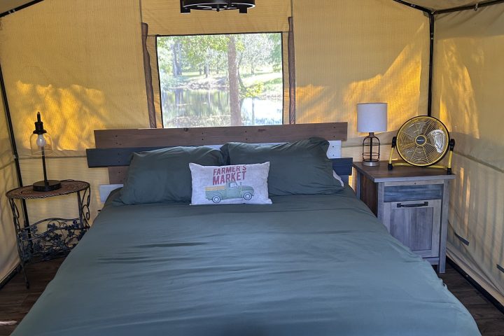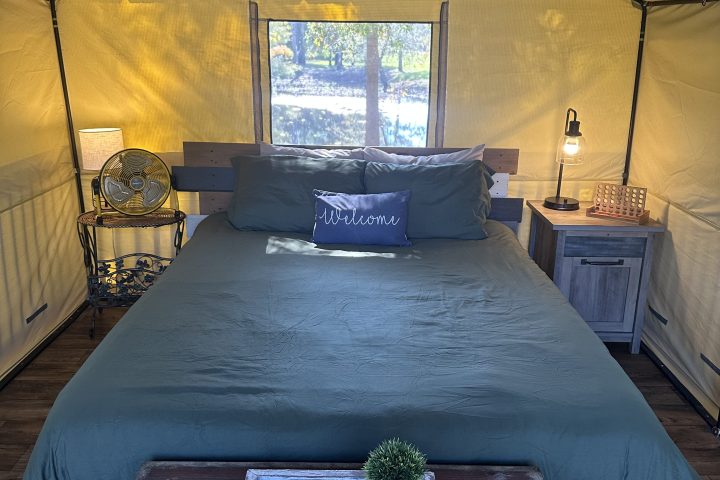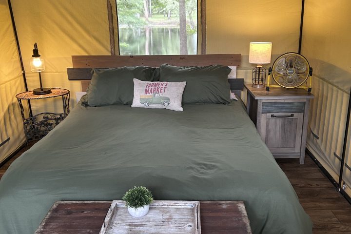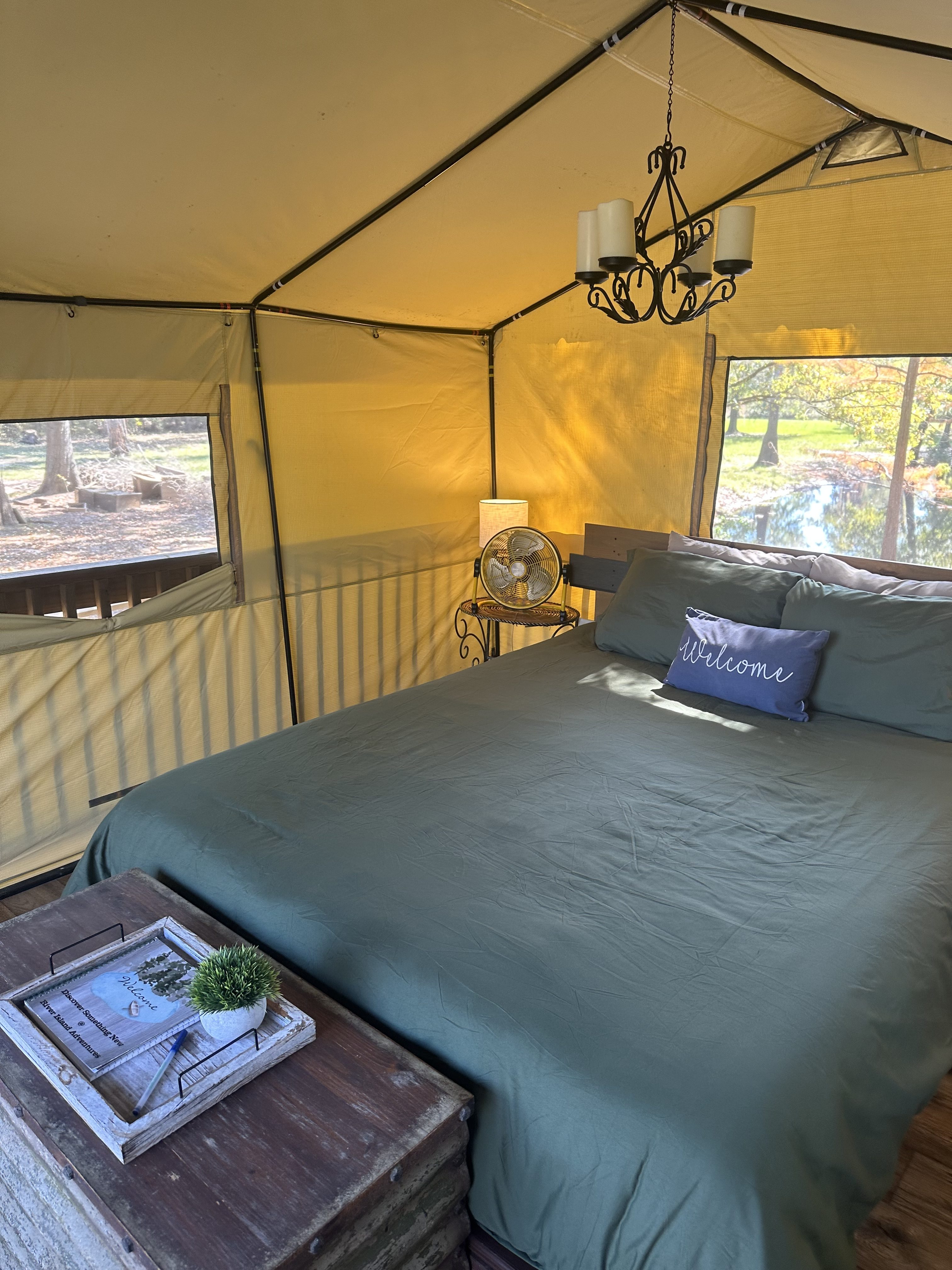 A perfect compromise between staying in a hotel and not sleeping on the ground. Enjoy the comfort of a canvas tent featuring a queen size bed with comfy linens, chandelier, fan & propane heater.