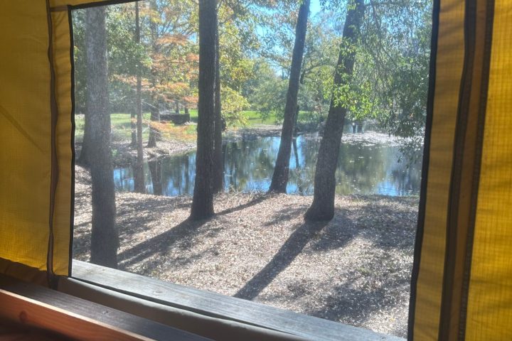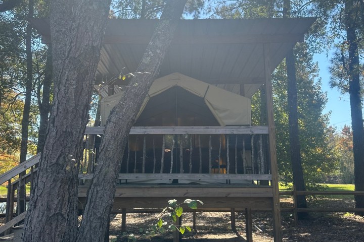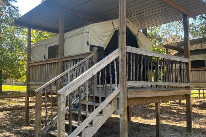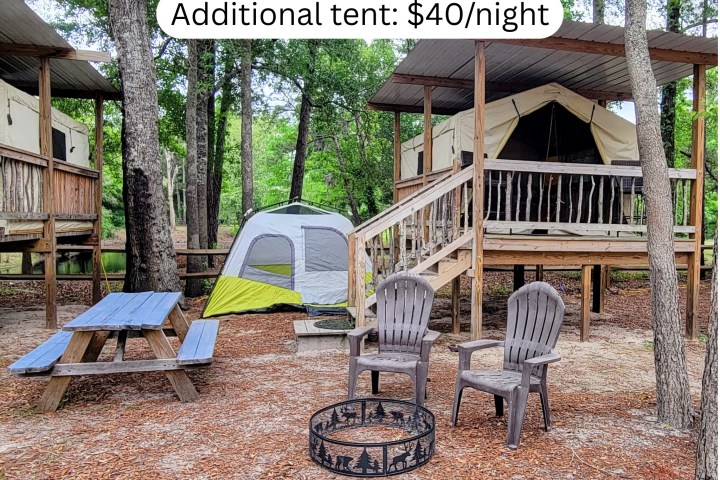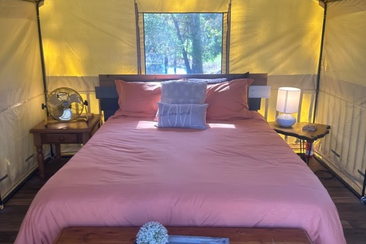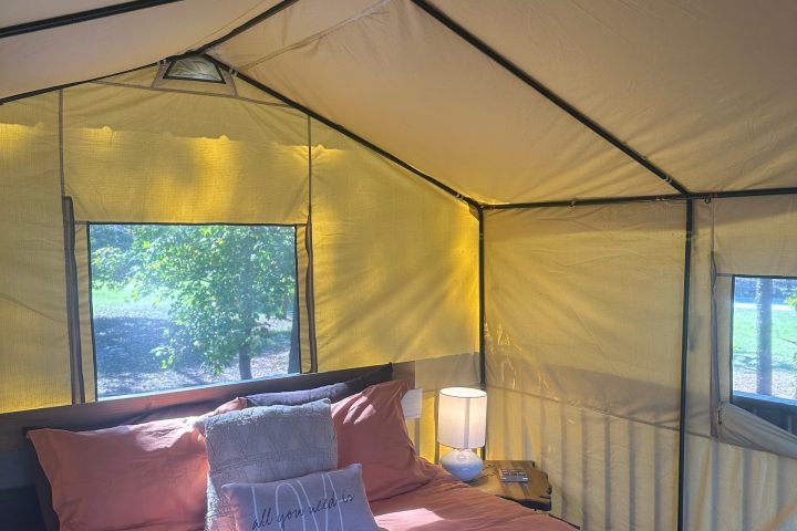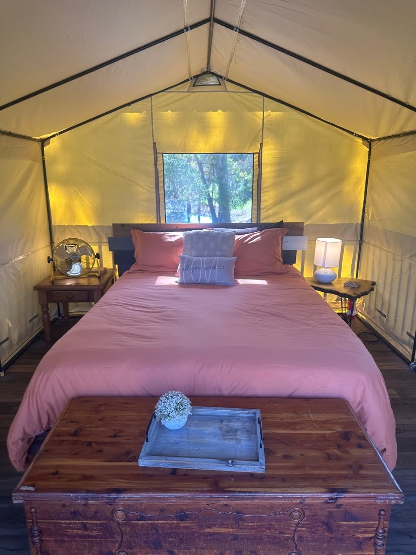 A perfect compromise between staying in a hotel and not sleeping on the ground. Enjoy the comfort of a canvas tent featuring a queen size bed with comfy linens, chandelier, fan & propane heater.