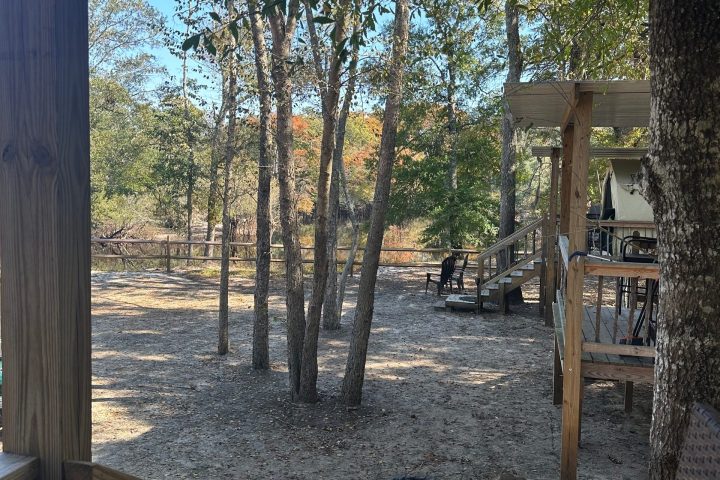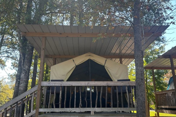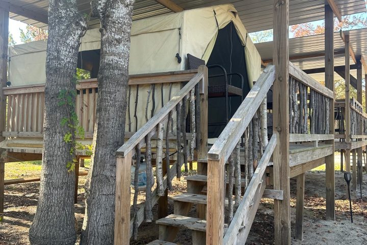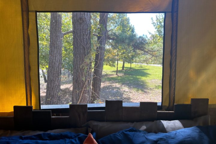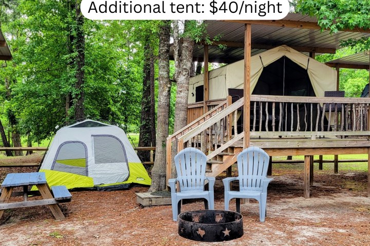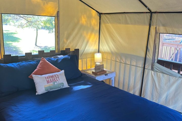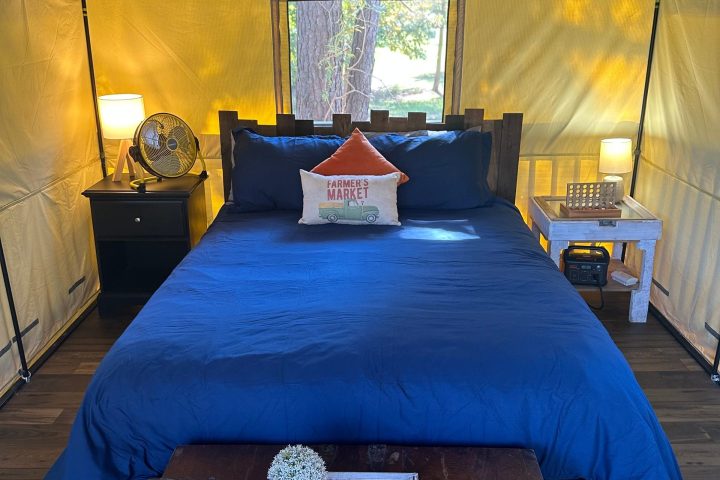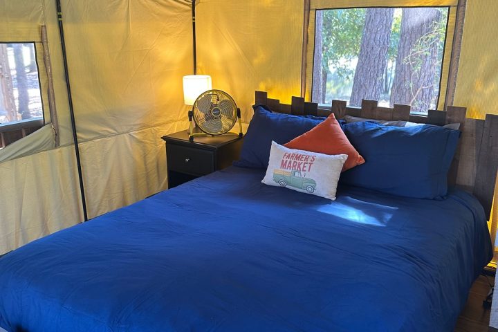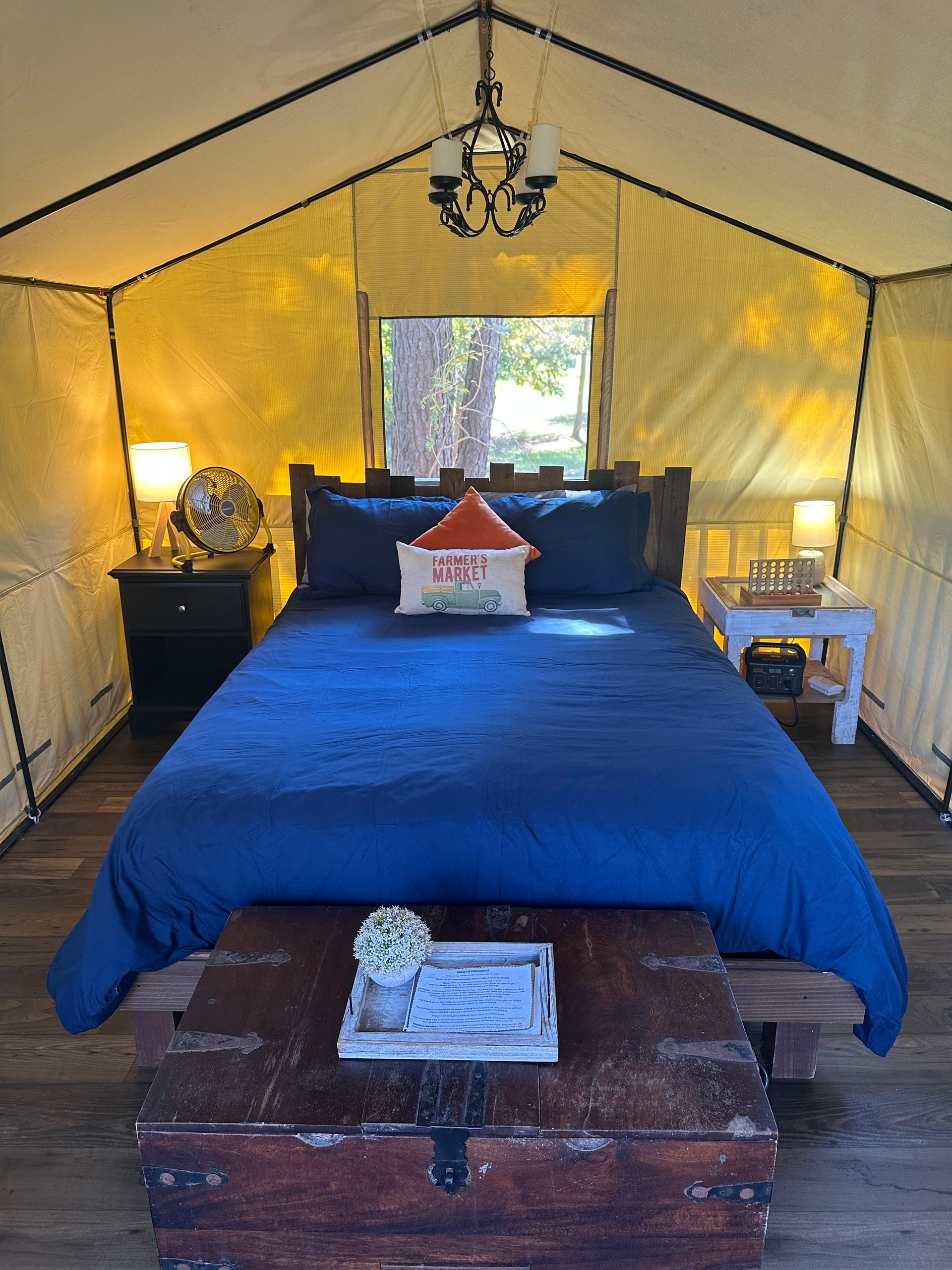 A perfect compromise between staying in a hotel and not sleeping on the ground. Enjoy the comfort of a canvas tent featuring a queen size bed with comfy linens, chandelier, fan & propane heater.