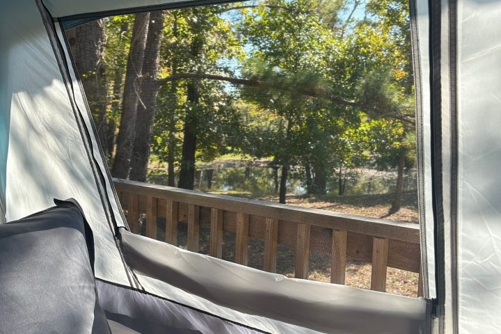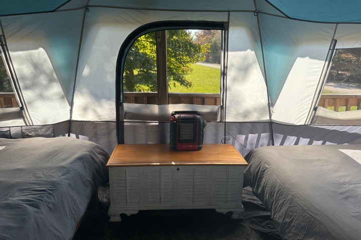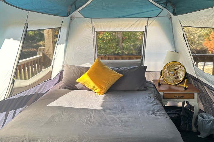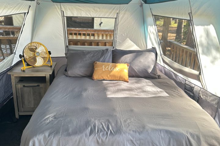 A perfect compromise between staying in a hotel and not sleeping on the ground. Enjoy the comfort of a canvas tent featuring a queen size bed with comfy linens, chandelier, fan & propane heater.