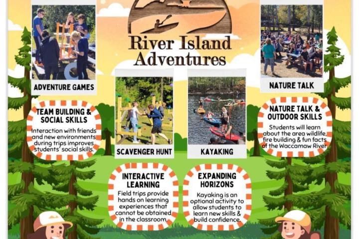 Students will be given safety instructions and can kayak on the Waccamaw River. Chaperones and/or parents will be required to help supervise students while on the water. Groups of up to 30 students can be on the water kayaking at one time.