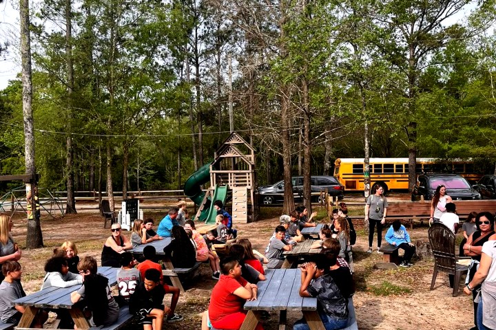 We’ve had students from schools all across the county as well as home school groups come spend the day with us. At our Outpost (where you park) we have the following amenities: restrooms, showers/changing rooms, hammocks, swings, stage, picnic tables, propane grills (propane supplied), fridge, ice maker, water dispenser, microwave, coffee maker, sinks and more. Most groups grill a lunch or bring a picnic lunch to eat before heading back to school. Students will also enjoy a variety of yard games available at the Outpost: giant connect 4, giant jenga, giant tic tac toe, corn hole, ring toss, slack line, etc.
